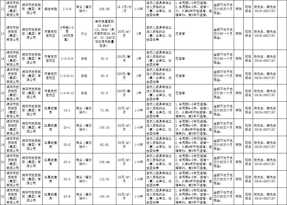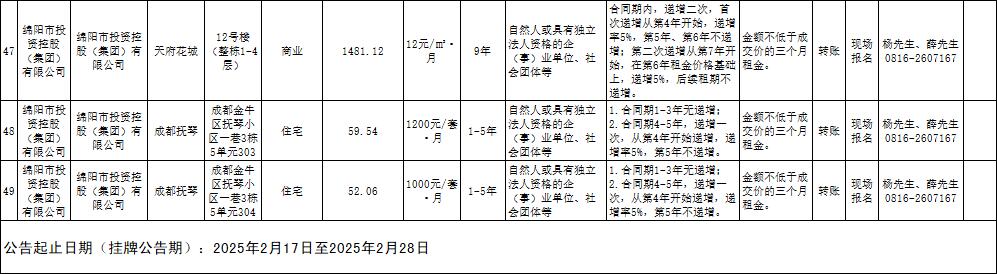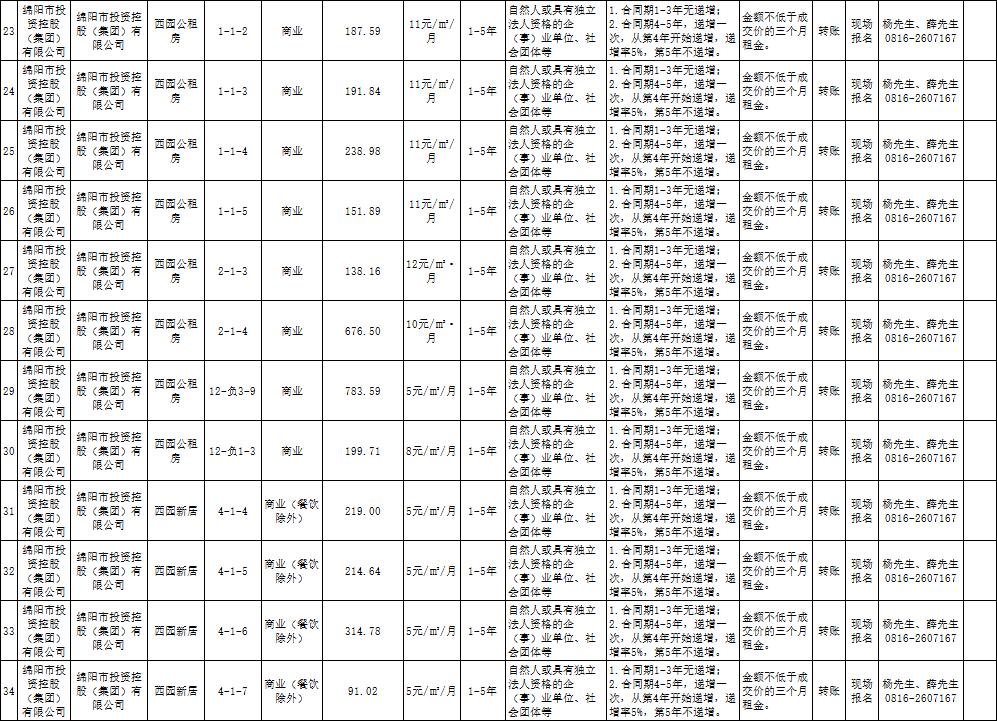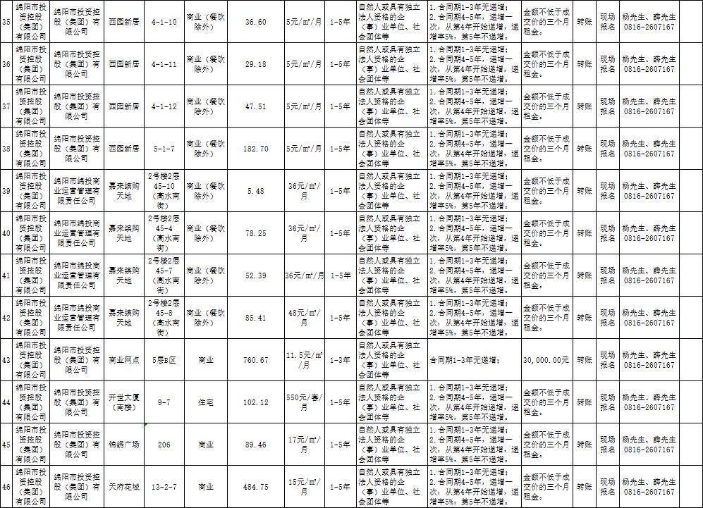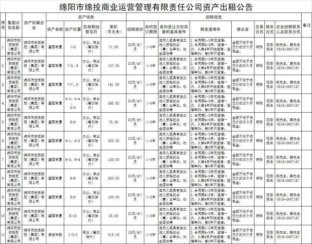 綿陽市綿投商業運營管理有限責任公司資產出租公告