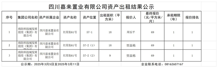 四川嘉來置業有限公司資產出租結果公示