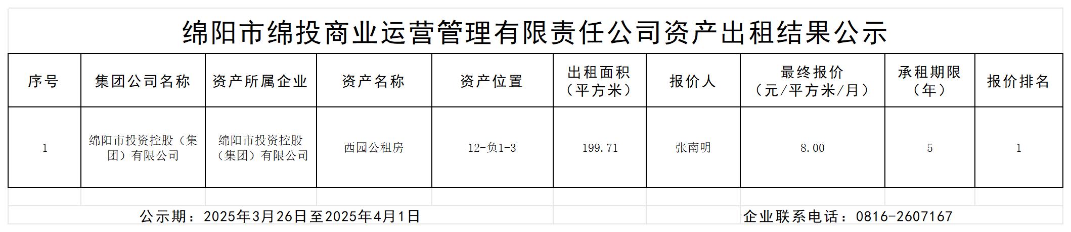 綿陽市綿投商業運營管理有限責任公司資產出租結果的公示