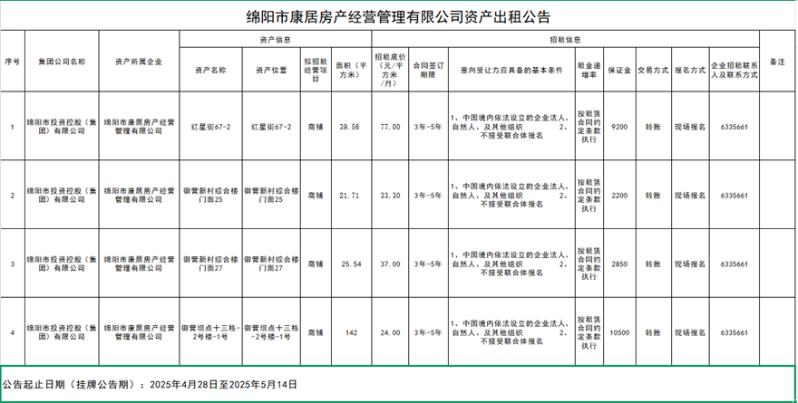 綿陽市康居房產經營管理有限公司資產出租公告
