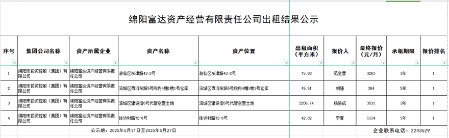 綿陽富達(dá)資產(chǎn)經(jīng)營有限公司出租結(jié)果公示