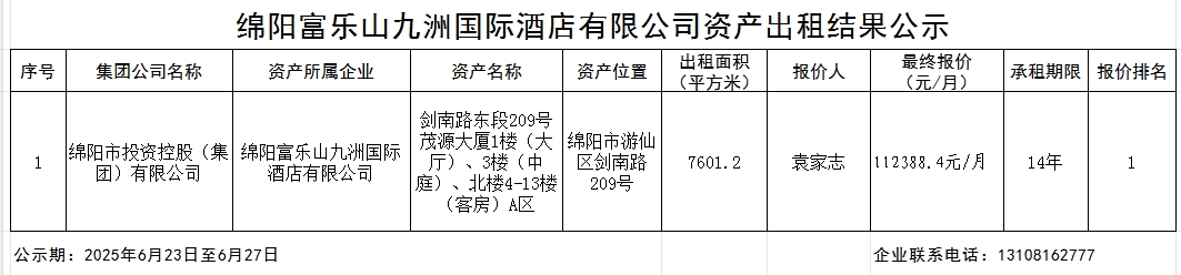 綿陽富樂山九洲國際酒店有限公司資產出租結果公示