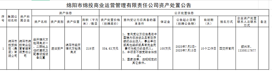 綿陽市綿投商業運營管理有限責任公司資產處置公告