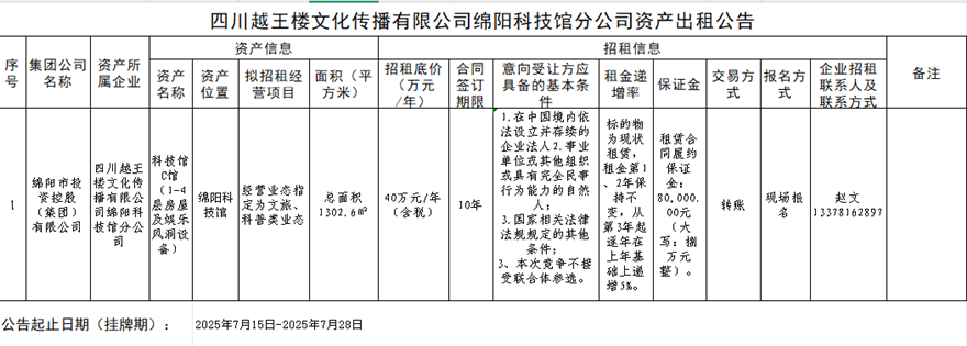 四川越王樓文化傳播有限公司資產出租公告