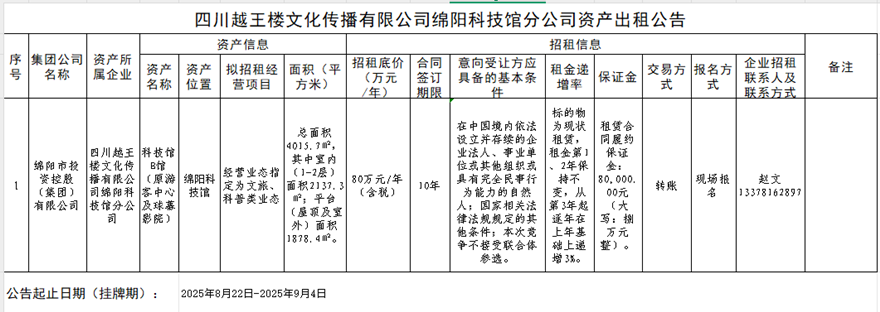 四川越王樓文化傳播有限公司綿陽(yáng)科技城分公司資產(chǎn)出租公告