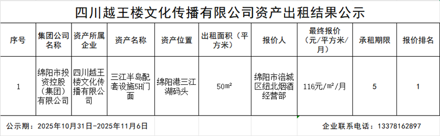 四川越王樓文化傳播有限公司資產出租結果公示