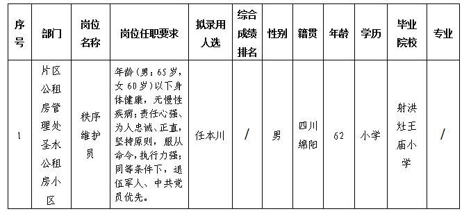 根據康居公司發(fā)布的長期招聘一線勤雜人員的招聘公告相關規(guī)定,經面試、體檢等程序,擬錄用任本川同志到綿陽市康居房產經營管理有限公司片區(qū)公租房管理處圣水公租房小區(qū)工作,現(xiàn)予以公示,具體情況如下: