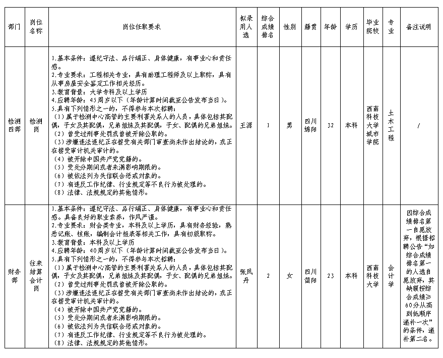 根據綿陽市建設工程質量檢測中心有限責任公司發布的招聘公告及招聘相關規定,經筆試、面試、背景調查、體檢等程序,擬錄用王源等同志到綿陽市建設工程質量檢測中心有限責任公司工作,現予以公示,具體情況如下: