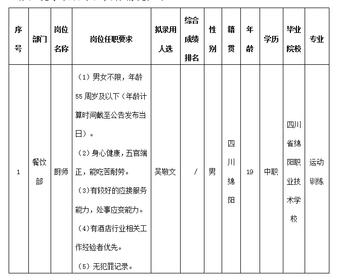 根據(jù)綿陽(yáng)市東津酒店管理有限責(zé)任公司發(fā)布的招聘公告及招聘相關(guān)規(guī)定,通過面試等程序,擬錄用吳敬文同志到餐飲部工作,現(xiàn)予以公示,具體情況如下:
