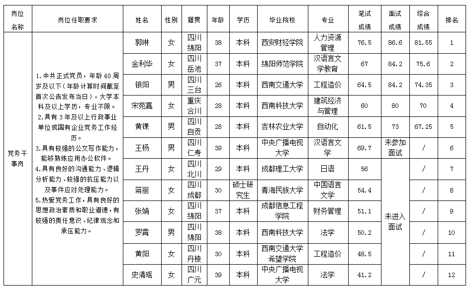 根據(jù)綿陽市投資控股(集團)有限公司發(fā)布的招聘公告及招聘相關規(guī)定,經筆試、面試等程序,現(xiàn)將筆試(面試)成績予以公示。