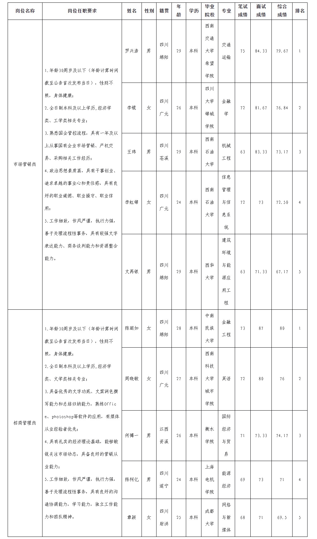 根據綿陽市綿投商業運營管理有限責任公司發布的招聘公告及招聘相關規定,經筆試、面試等程序,現將筆試、面試成績予以公示。