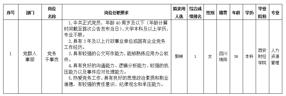 根據(jù)綿陽市投資控股(集團)有限公司發(fā)布的招聘公告及招聘相關規(guī)定,經(jīng)筆試、面試、考察、體檢等程序,擬錄用郭琳同志到綿陽市投資控股(集團)有限公司工作,現(xiàn)予以公示,具體情況如下: