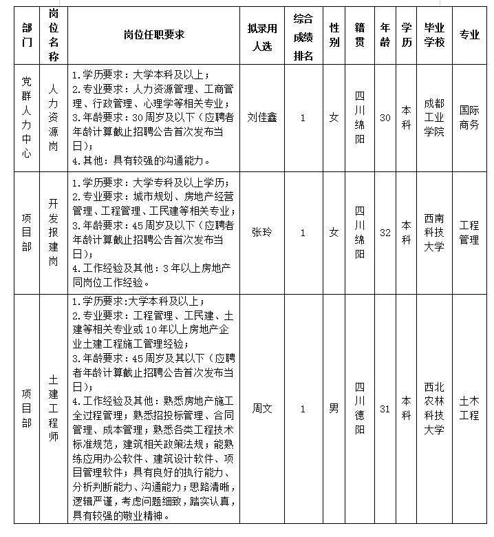 根據綿陽市綿投置地有限公司發布的招聘公告及招聘相關規定,經筆試、面試、考察、體檢等程序,擬錄用劉佳鑫等3名同志到綿陽市綿投置地有限公司工作,現予以公示,具體情況如下: