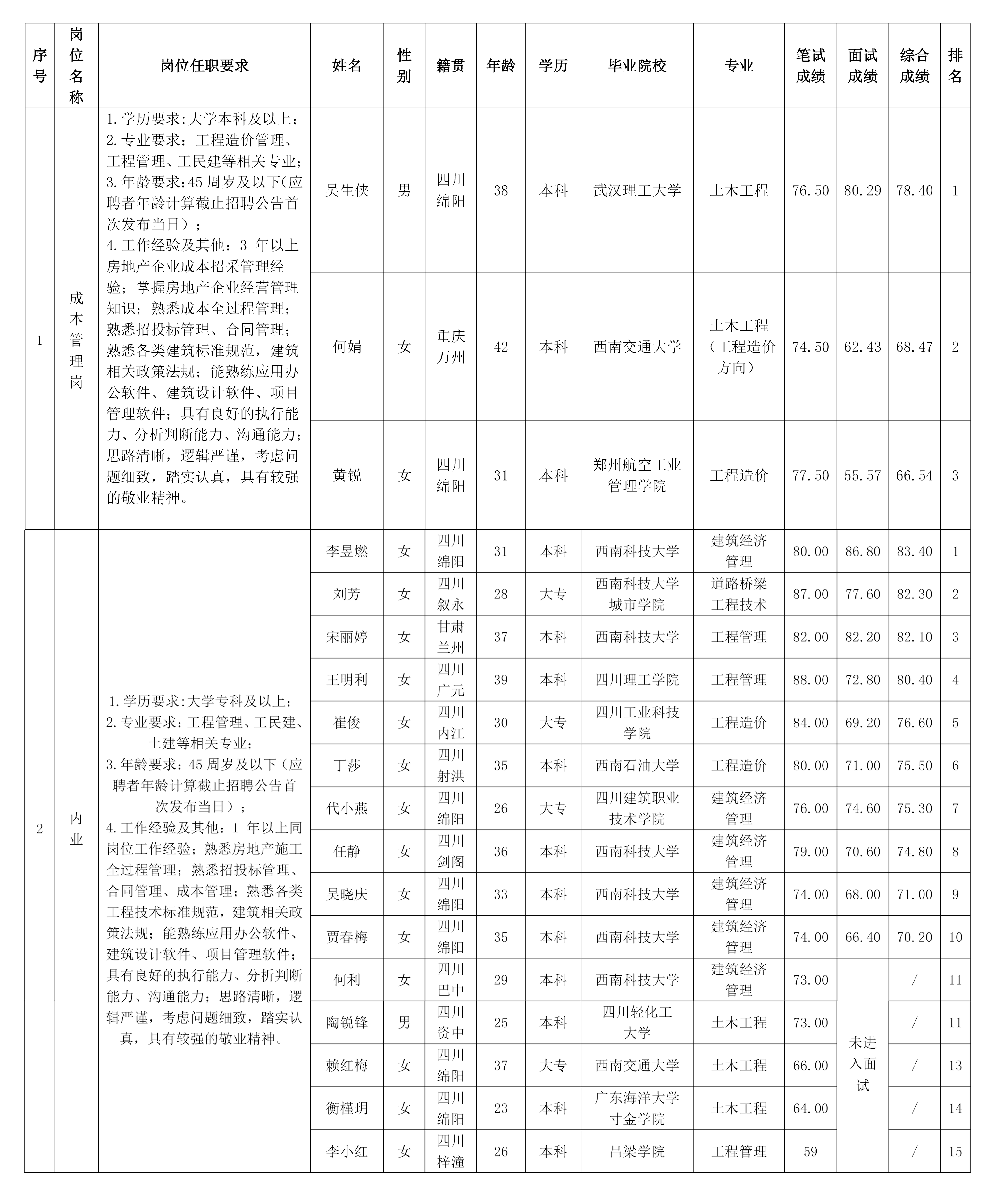 根據綿陽市綿投置地有限公司發布的招聘公告及招聘相關規定,經筆試、面試等程序,現將筆試、面試成績予以公示。