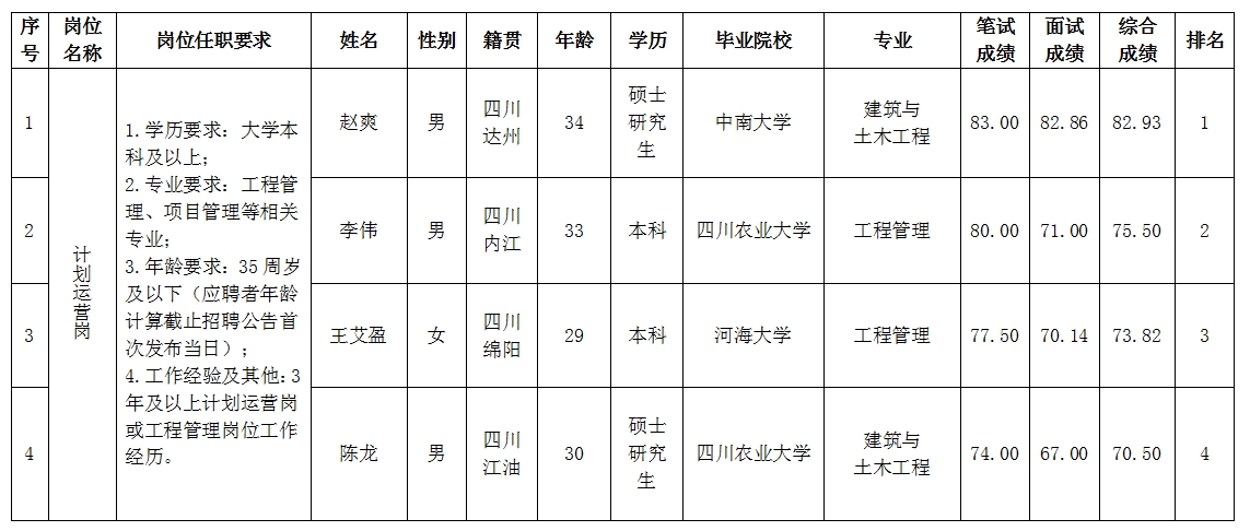 根據綿陽市綿投置地有限公司發布的招聘公告及招聘相關規定,經筆試、面試等程序,現將筆試、面試成績予以公示。
