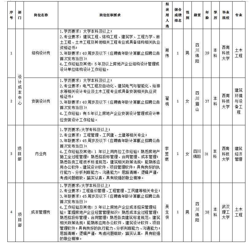 根據(jù)綿陽市綿投置地有限公司發(fā)布的招聘公告及招聘相關(guān)規(guī)定,經(jīng)筆試、面試、考察、體檢等程序,擬錄用謝偉等4名同志到綿陽市綿投置地有限公司工作,現(xiàn)予以公示,具體情況如下: