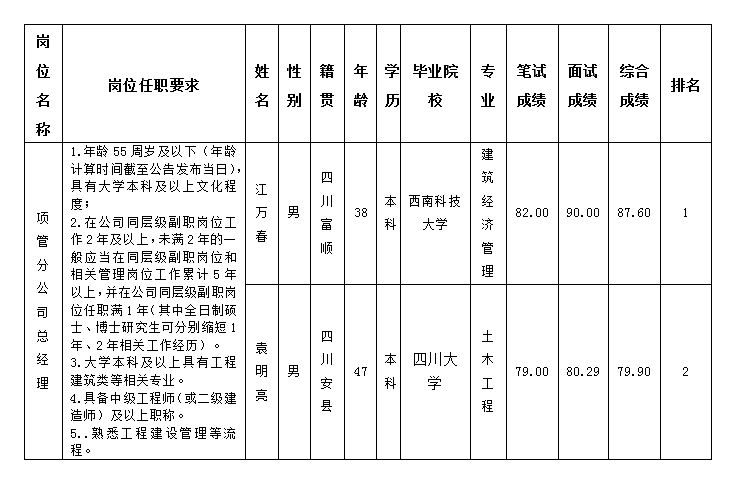 根據四川嘉來建筑工程有限公司發布的延長項目管理分公司總經理崗位報名時間的公告及相關規定,經筆試、面試等程序,現將綜合成績予以公示。