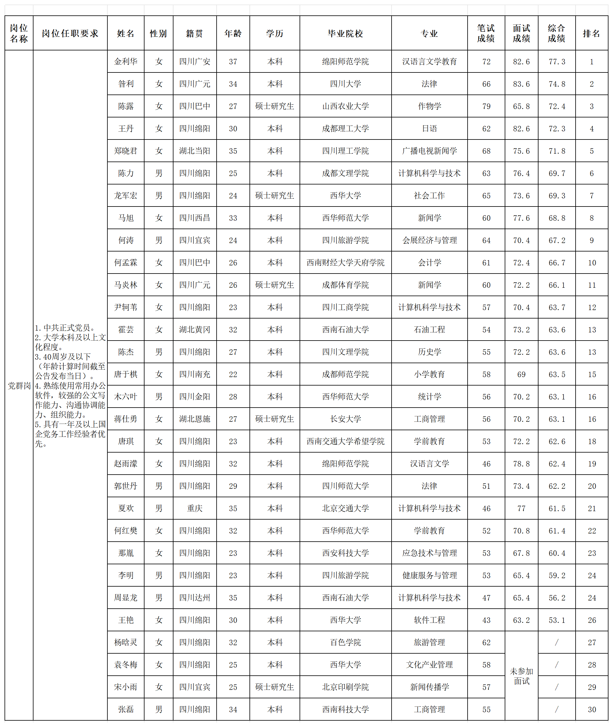 根據四川越王樓文化傳播有限公司發布的招聘公告及招聘相關規定,經筆試、面試等程序,現將筆試(面試)成績予以公示。