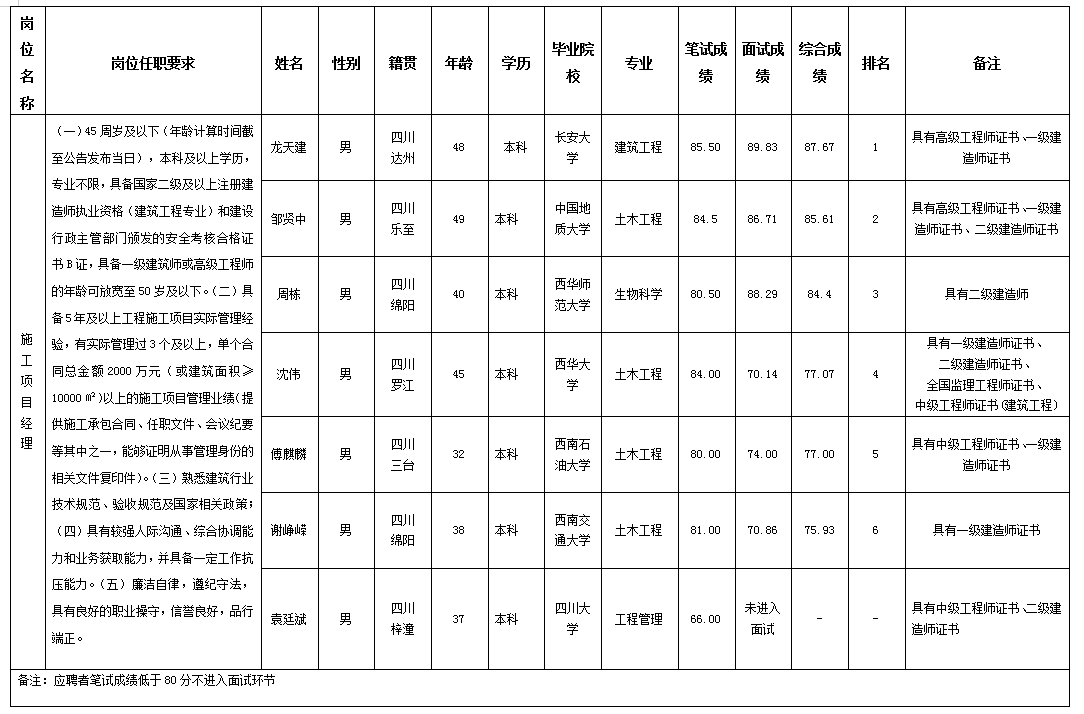 根據四川嘉來建筑工程有限公司發布的關于招聘施工項目經理崗位的公告及招聘相關規定,經筆試、面試等程序,現將筆試(面試)成績予以公示。
