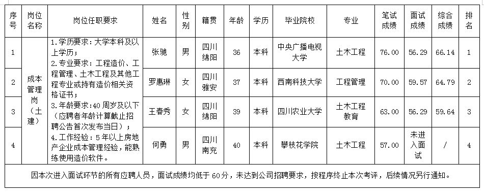 根據綿陽市綿投置地有限公司發布的招聘公告及招聘相關規定,經筆試、面試等程序,現將筆試、面試成績予以公示。
